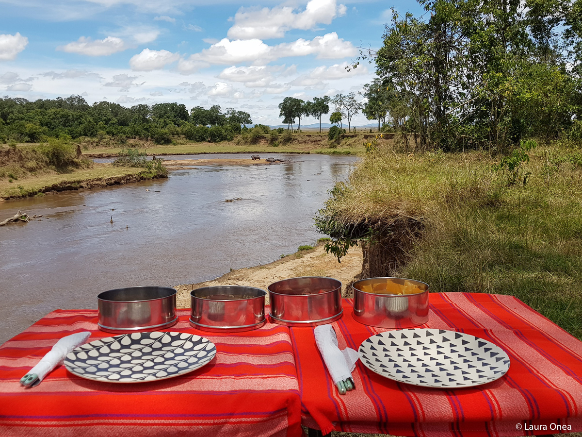 After a couple more encounters with a giant lizard, elephants, zebras, giraffes, hyenas and hyena poo (which is white, in case you were wondering) we drove into our first lunch spot, one of the many delightful picnic spots carefully chosen by our two guides. We entered straight into an enchanted forest, which was more like a patch of trees that seemed endless due to its sudden position in the middle of a vaster raw savanna. If you remember the scene where the kids in “The Chronicles of Narnia” go into the wardrobe on one door and exit into a magical world of snow and trees, this is exactly how I felt then, the main difference being that we didn’t have snow but lush green trees and a view with a pool of hippos! While we were pleasing our senses with the surroundings and photographing the lazy shiny hippos, James and Elianto prepared the lunch for us. I don’t know if it was because of the place, the delicious food, the whole experience or all of the above, but that felt like one of the best lunches I have ever had.