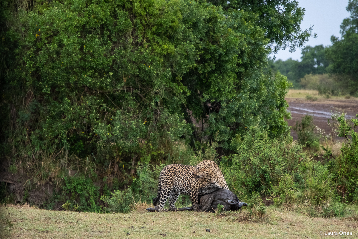 As if trying to compensate for the trouble, they set on a last hunt for the leopard before getting back to the camp. We did find him, but when we got to the place there were tons of cars ostentatiously invading his territory, with lots of people desperate to catch a front row seat for the show. We took a step back. As James, who once again showed his discretion and knowledge of the animal behaviour, suggested, we waited. We waited until the leopard made his way down into the valley, and we waited some more until the other people got bored and left. James was amazing in anticipating where the animal would show up with his prey and we went straight to that spot, where we could peacefully observe him. Soon after he became quite distressed by the approaching pack of hyenas, so he abandoned the prey and left, making room for the scavengers. Such a treat!